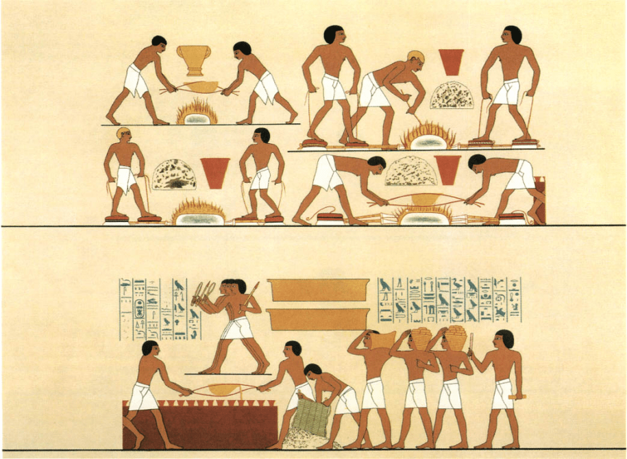 The scene showing metal workers is part of a wall depicting different professions in the tomb of Rekhmire’, vizier of Tuthmosis III and Amenophis II. Above, the fires are kept ablaze with foot-operated bellows; below, the men are casting bronze doors in a large mould. The inscription states that the bronze is brought from Asia, from the land of Retjenu. Atlas of Egyptian art. Page 119
