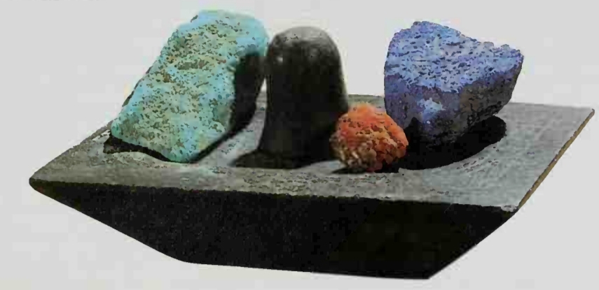 Basalt palette and grinder used for the preparation of the raw materials of paint, here represented by three pieces of coloured frit. Found in Thebes and probably of New Kingdom date, 1450-1250 BC. Length of palette 12 cm (no.5547). 1