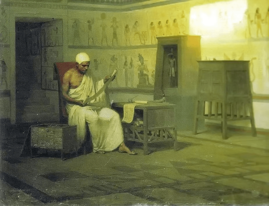 In seiner Amtsstube, die er mit eigener Hand sauberhielt, waren die sorgsam geordenten Papyrusrollen in hölzernen Truhen und Tonkrügen verwahrt oder lagen, in Leder gehüllt, auf Wandbrettern – Christian Jacq, Die Herrin von Abu Simbel